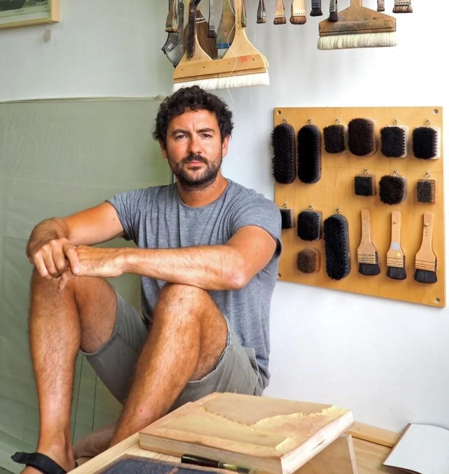 Adrian Holmes (b.1982) is a printmaker devoted to Japanese printmaking and Sosaku hanga. He graduated from the University of Plymouth with a degree in Visual Arts. He fell in love with woodblock Japanese printmaking whilst living in Japan and he began to study the craft and its techniques. Both self-taught and working alongside Japanese woodblock artisans exploring the capabilities of the printing process, Adrian divides his time between his woodblock practice and teaching woodblock printmaking In the south west. Adrian is based at Krowji studios in Cornwall and teaches Japanese woodblock printmaking at both St Ives School of Painting and the West dean College of Arts.